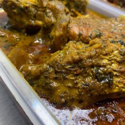 Boiled plantain,Efo riro and goat meat