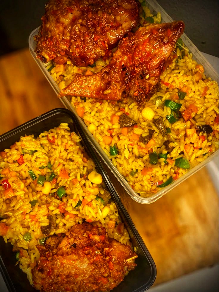 Nestled on top is a generous portion of succulent, spice-infused chicken, coated in a glossy, well-marinated pepper glaze that promises bold flavour, juicy tenderness, and irresistible satisfaction.